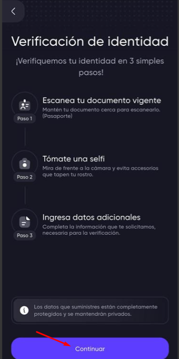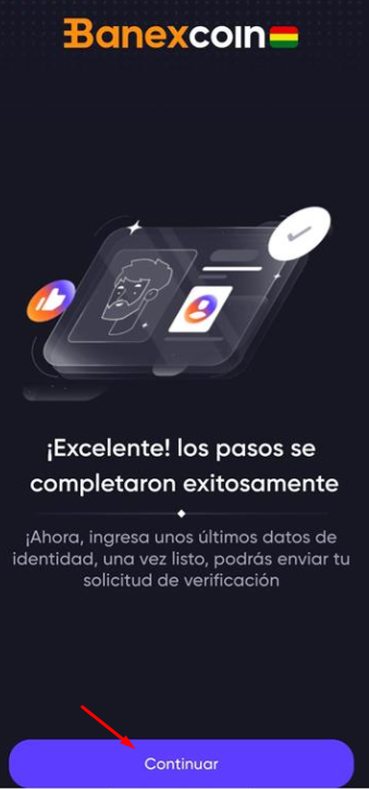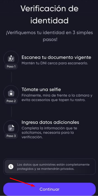 Una vez hayas ingresado tu documento de identidad y tu foto selfie, espera unos segundos y hacer clic en “CONTINUAR” para que continúes con la siguiente etapa donde deberás completar la información requerida para verificar tu identidad.