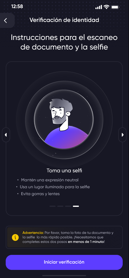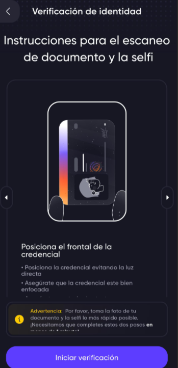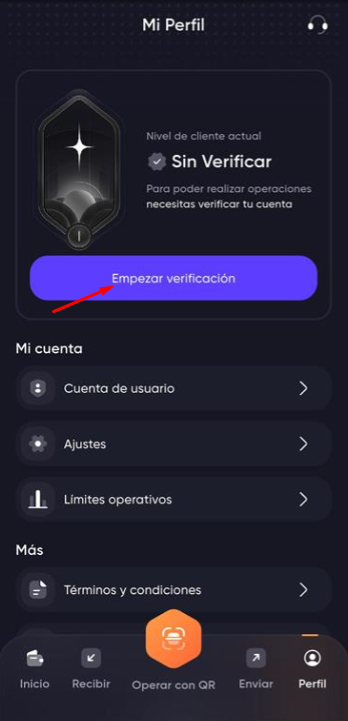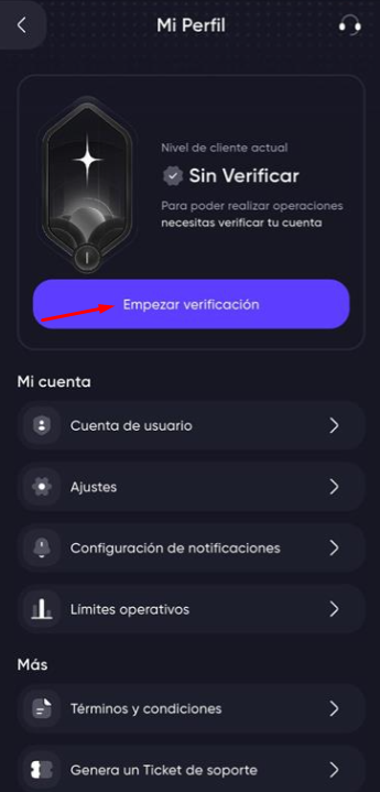 En este ejemplo,observaremos cómo realizar la verificación de identidad, para ello debes dirigirte a "Perfil" (presiona en Perfil parte superior a la izquierda de tu pantalla) y luego presionar el botón de "Empezar verificación" y seguir las instrucciones que verás a continuación.