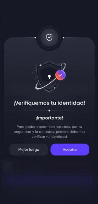 Cuando inicias sesión, luego de haber verificado tu teléfono y autorizado el token, podrás ver esta pantalla de "Verifiquemos tu identidad", para empezar el proceso de validación de tu identidad deberás presionar el botón de "Aceptar", en el caso de que quieras hacerlo luego puedes presionar el botón "Mejor Luego"