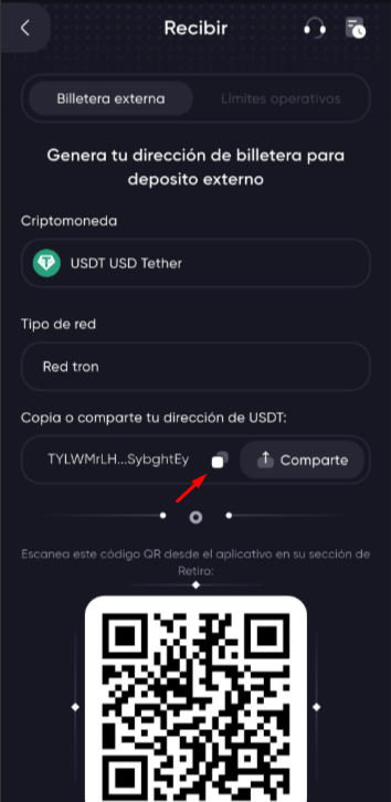 Escanea el código QR o copia la dirección que aparece abajo y utilízalo para indicar el destino de los fondos, cuando se realice la transferencia el saldo de tu cuenta será actualizado automáticamente una vez que la red de criptoactivos confirme tu transacción.