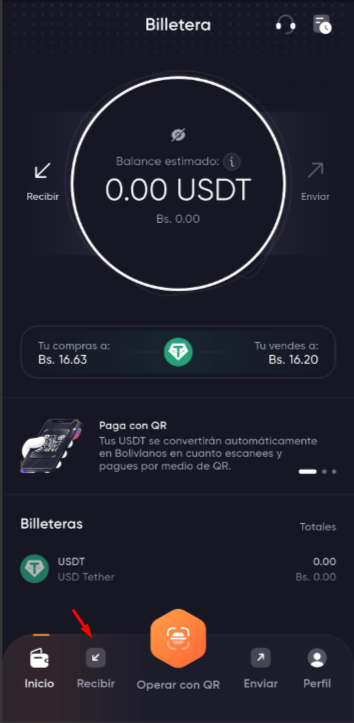 Seleccione la opción de Recibir: Hay 2 formas de realizar una recargar o de agregar fondos a su cuenta con criptoactivos (USDT), la primera esta en el menú de acciones rápidas botón "Recibir de Billetera", la otra forma, esta en la parte inferior izquierda de tu pantalla, opción "Recibir"