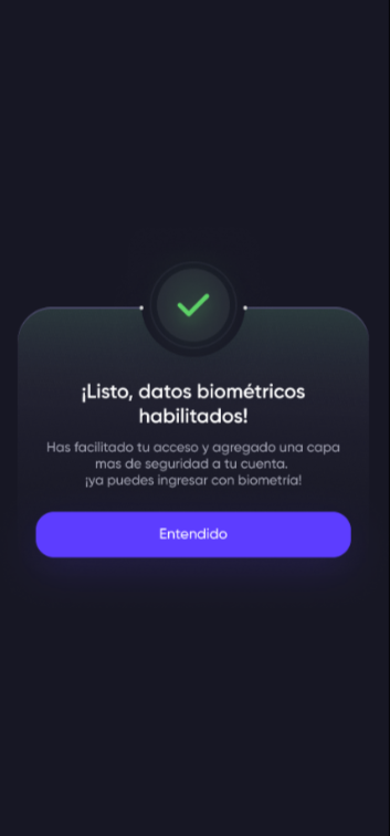 Luego que lo configures verás esta pantalla indicando que fueron habilitados los datos biométricos presiona "Entendido" y ya estas listo para empezar a utilizar nuestra app de Banexcoin con toda la seguridad