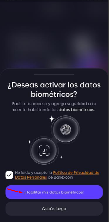 Luego presiona sobre la casilla que podrás observar a la izquierda del texto "He leído y acepto la Política de Privacidad de datos personales de banexcoin", esto significa que has leído y aceptas los términos y condiciones, luego presiona el botón "Habilitar mis datos Biométricos"