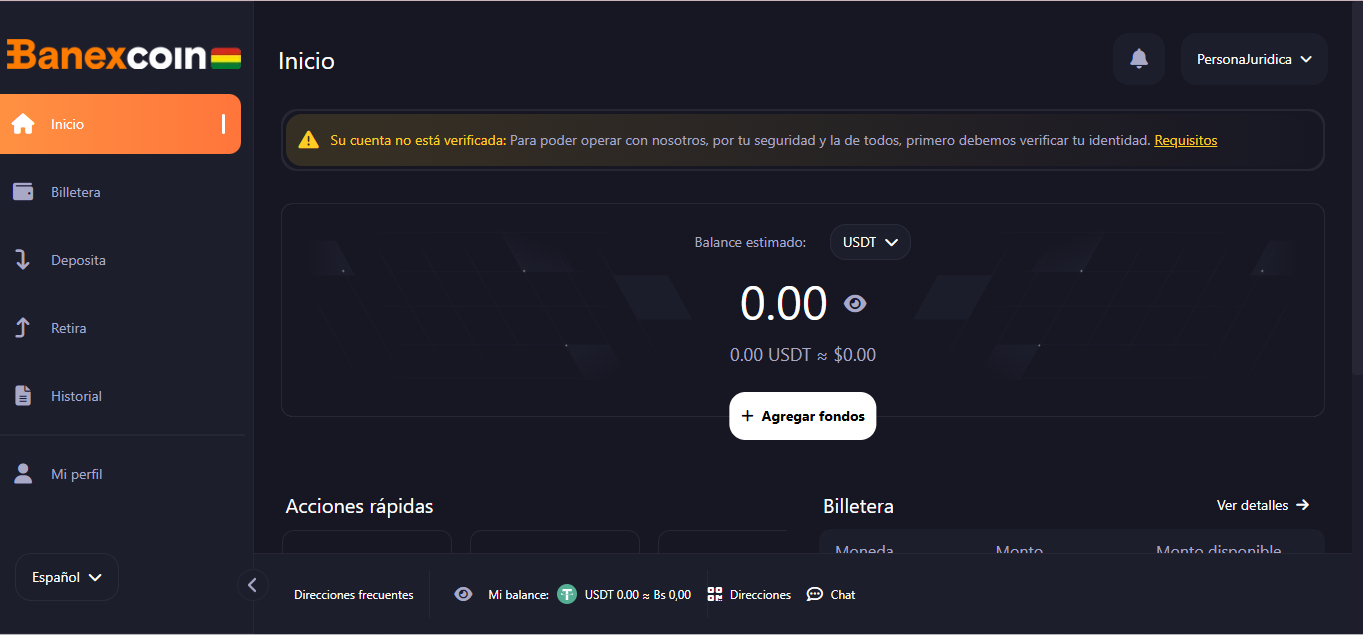Después de validar el código, ingresará directamente al panel de su cuenta jurídica.